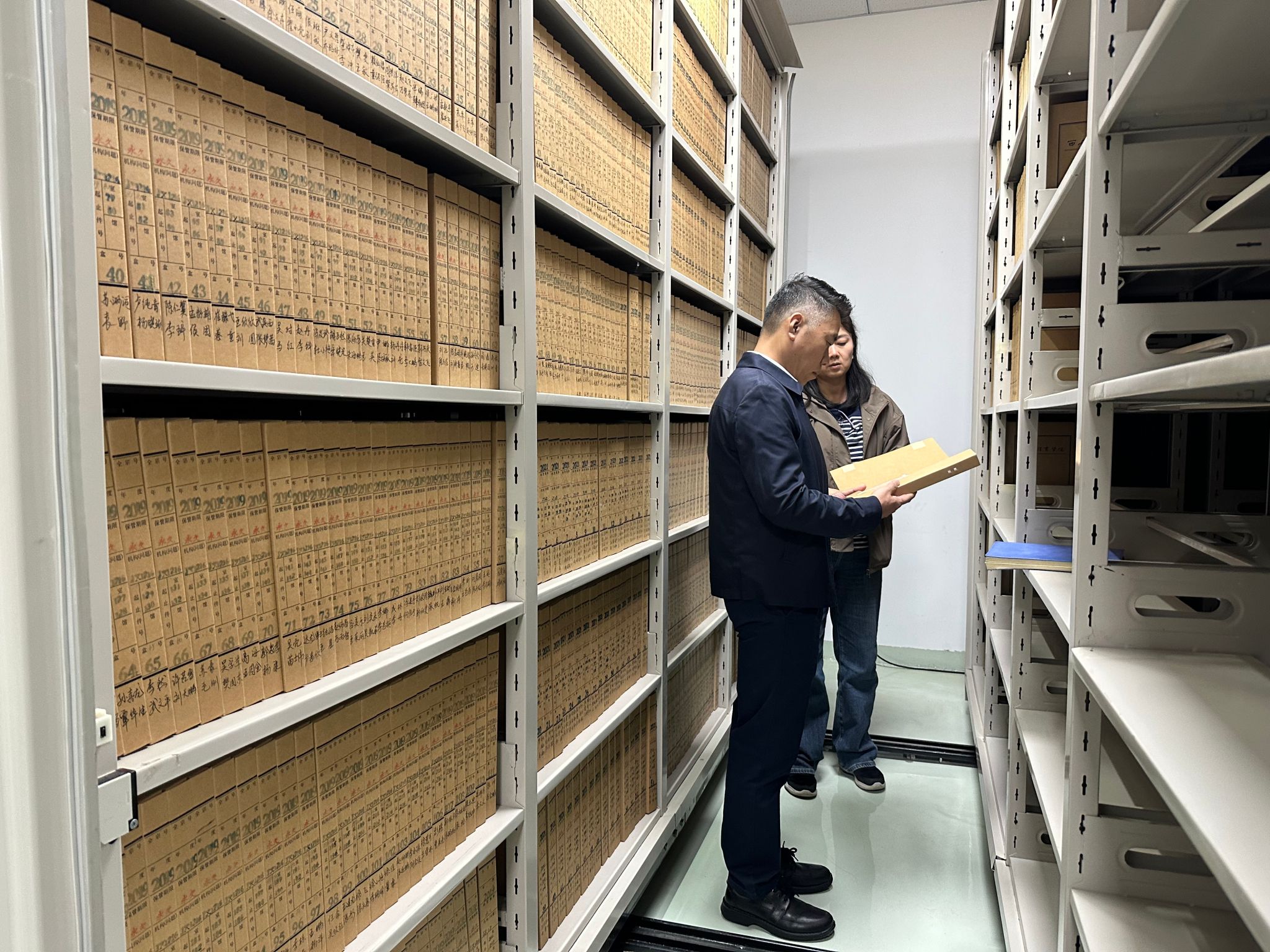 张军一行实地察看了档案馆的档案库房、整理编目室、数字化加工现场及办公室等功能区域,详细询问了馆藏档案的数量与结构、珍贵特色档案的保管与利用、档案数字化建设进展以及安全防护设施配备与运行状况。调研过程中,张军一行了解了近年来在资源收集、保管保护、数字化建设、人事档案管理等方面内容,并认真询问大家在工作中遇到的实际困难与挑战。