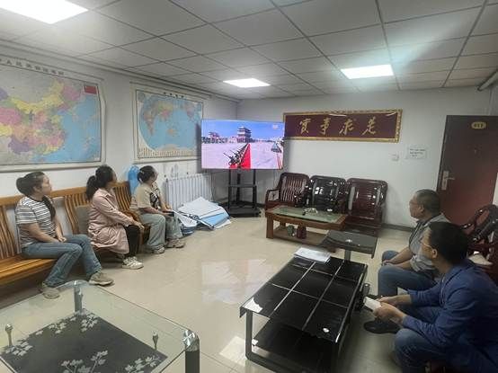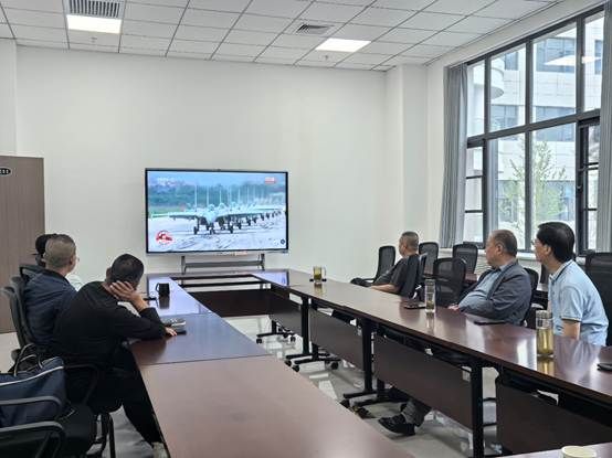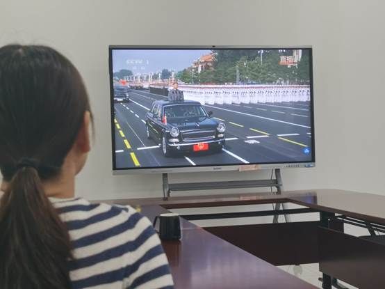 当日,基建处全体职工提前进入会议室,大家怀着崇敬与期待的心情,准时收看阅兵直播。当电视屏幕中奏响激昂的国歌,鲜艳的五星红旗冉冉升起时,现场职工庄严肃立,向国旗行注目礼,心中满是对祖国的热爱与敬意。