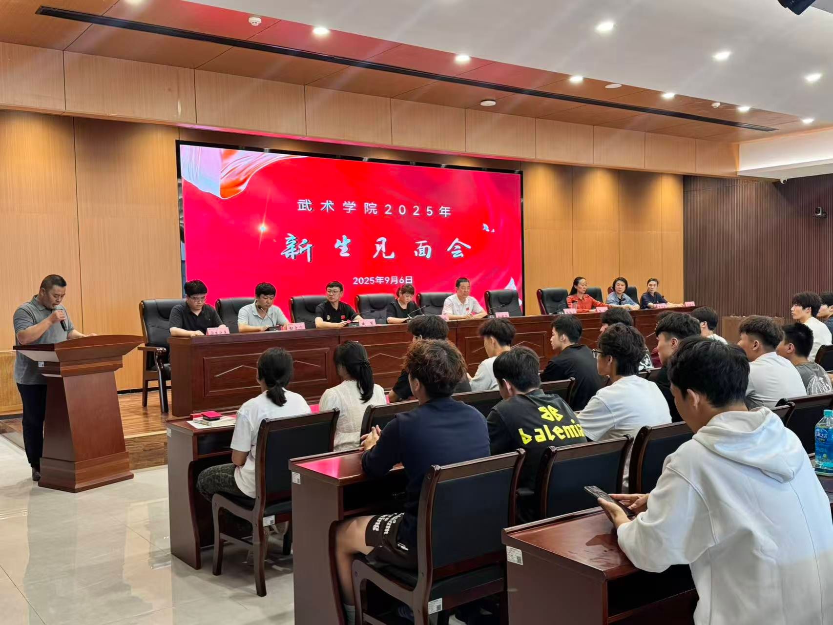 2025年9月6日,武术学院在鄠邑校区行政综合楼541会议室召开了新生见面会,武术学院院长袁金宝、总支书记刘耀荣、学院各办公室、教研室主任及支部书记参加。会议由2025级辅导员智文飞主持