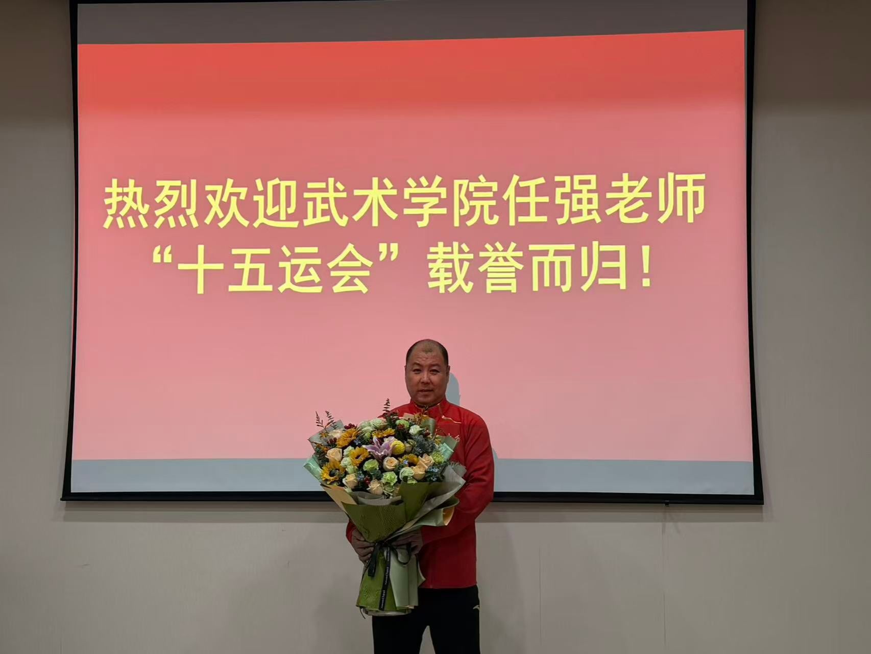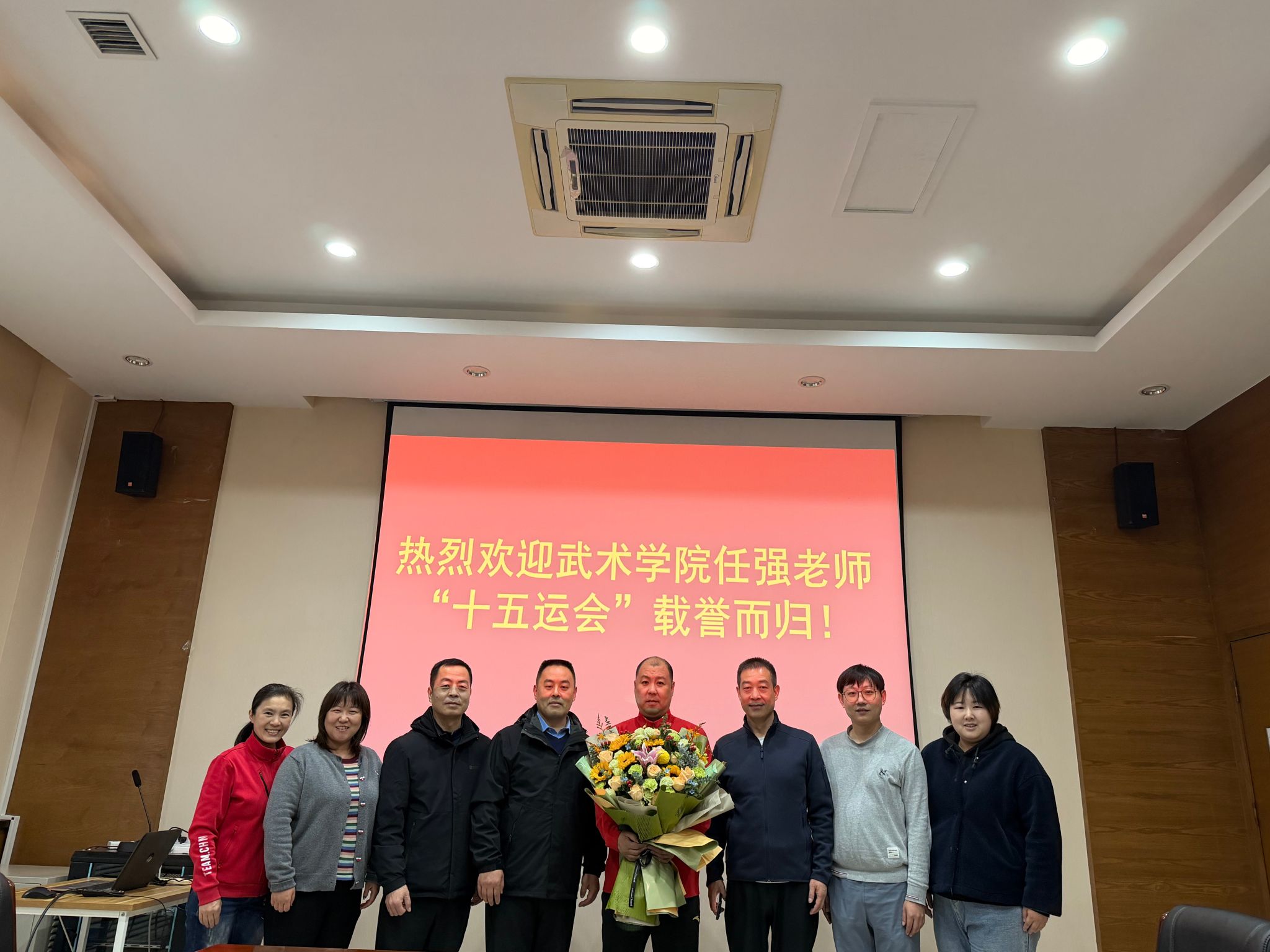 近日,我院散打教研室任强老师带队在第十五届全国运动会斩获“1金1银1铜”的优异成绩,为校争光。为表彰先进、弘扬拼搏精神,武术学院于11月15日下午在含光校区举行欢迎会,学院党总支书记刘耀荣、院长袁金宝等参加欢迎会。