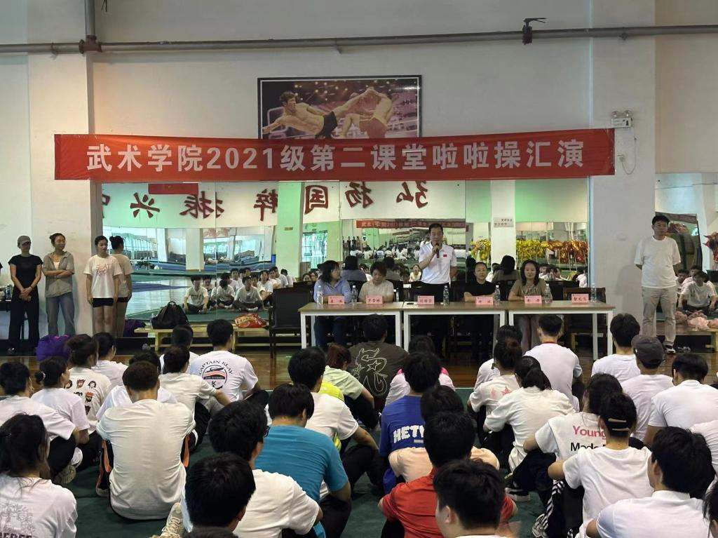 为了全面落实学校“十大改革工程”及学风建设,丰富学生课余生活,营造浓厚的校园文化氛围,发展学生兴趣特长,体现我校的育人特色,培养学生的审美情趣。2024年6月20日下午5时,武术学院在套路馆召开了“武术学院2021级第二课堂啦啦操汇报表演”。参加活动的有武术学院院务会成员、指导教师许波、俞丹以及2021级全体学生。