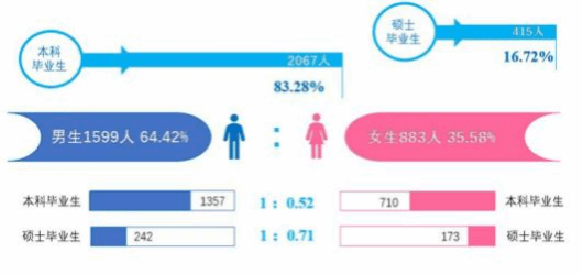从性别结构来看,男生1599人(64.42%),女生883人(35.58%),男女性别比为1:0.55 。分学历层次来看,其中本科毕业生男女性别比