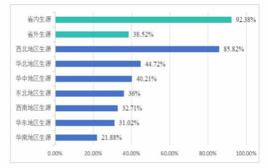 分生源毕业去向落实率。省内生源为1143人,省外生源为1339人,参考登记人数后省内生源的毕业去向落实率(89.68%)略高于省外生源毕业去向落实率(84.62%)。可见,省内毕业生较于省外更具优势。